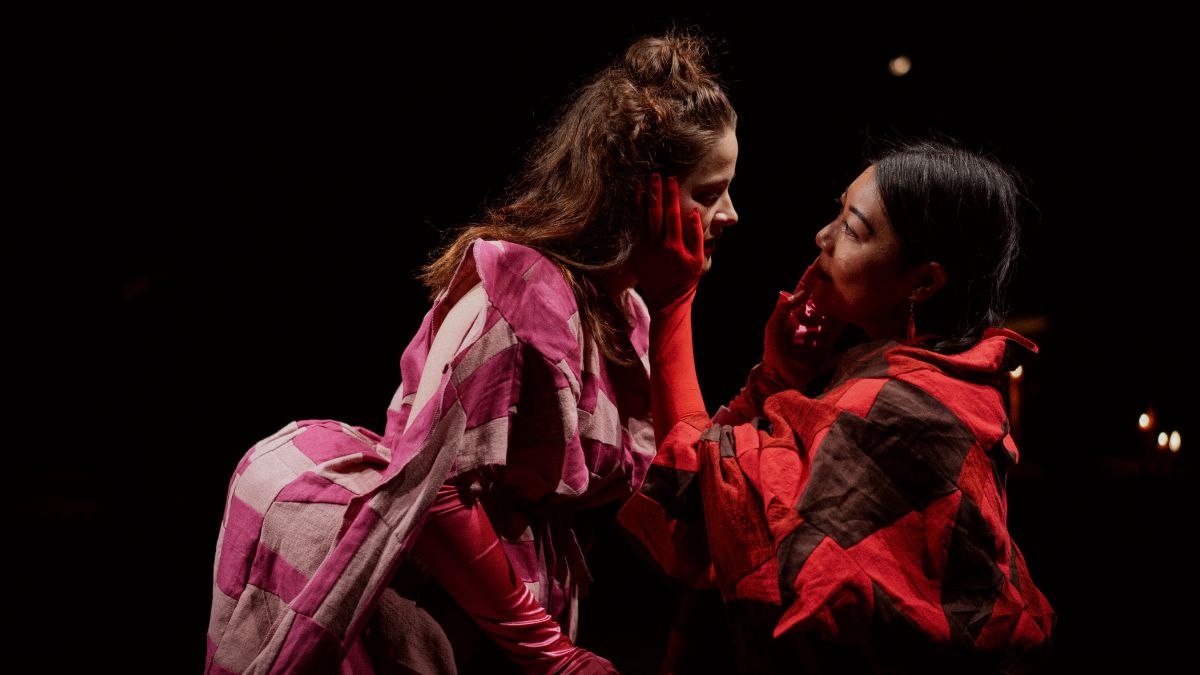 As you walk into the theatre room, the Bluey stage opens up to seating on the back and side walls. As you cross the second threshold, you find instrumentalists flanking the walls next to you. The stage is laid out with seating on the back and side walls in a U-shape, with O and E kneeling on the floor in the middle of the stage you cross to get to your seat. The story starts with a stretch of silence which makes you susceptible to falling into the meditative state the actors seem to be held in; as if they’re pulling you into their reality. The silence is broken with a romantic scene with the genderless characters. From the first movement, Charis Postmus stirs the room with her rambunctious portrayal of E in what can only be described as an operatic clown.