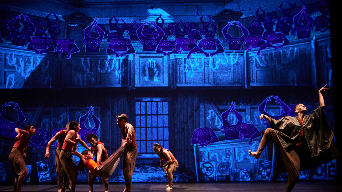 These necessary changes are successful in bringing the story forward for a 2024 audience. However, there are some elements that seem overlooked. Shere Khan has been omitted in this telling, and replaced by a nameless figure bent on hunting the animals- which, for me, muddies the timeline of Mowgli being left behind by the other humans. Not to mention, the setting seems to be a series of destroyed landmarks such as a British public library and underground train station. Meanwhile, in projected flashbacks, it’s clear that Mowgli has come from Kipling’s India- how far did she travel?! Moreover, the voice of Greta Thunberg is repeated throughout, hammering home the pertinence of Mowgli’s trials. Given Perth Festival’s recent severance from woodside I do question if, like Greta would have done, if Akram Khan’s ensemble was ferried to Australia by boat.