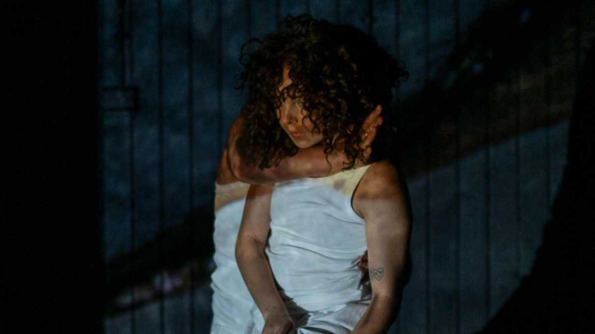 I’m somewhat partial to audiences being immersed immediately upon entering the theatre space, whether through a soundscape or, in this case, performers already on stage. This work, created by Shaun Johnston and performed by Nathan Turtur and Luther Wilson, explores the physicality and intimacy between men in wrestling or any contact sport. Nathan and Luther transition from high-intensity tackling to equally intense intimacy as they lock eyes and engage in softer movements with each other. Initially, what threw me off about this piece was the absence of music or any sound, but its lack made me question why I felt it needed that additional auditory element. As I listened to the performers grapple, grumble, and breathe, I realised that this was the only sound this piece needed, increasing our sense of proximity to the performers and enhancing the piece’s themes of touch and intimacy.